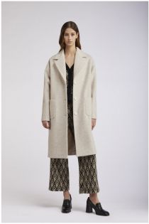 Abrigo de botonadura simple con bolsillos tipo parche confeccionado en tejido de poliviscosa con estampado de resca.