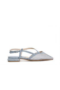 Bailarinas de denim abiertas por detrás con cinturón detrás y apertura de forma asimétrica. característica la malla decorada con pedrería. tacón forrado de denim de 15 mm de altura.