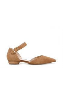 Bailarinas de ante con correa en el tobillo con punta afilada. Tacón bajo forrado del mismo material que la pala