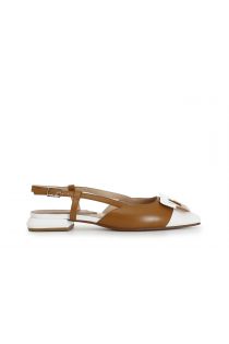 Bailarinas de piel con la parte trasera abierta y accesorio cuadrado que decora la punta. tacón forrado de piel.