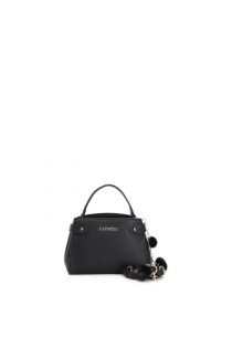 Minibolso en material efecto abatanado y cierres metálicos. bolso para llevar en la mano o con bandolera opcional con pompones.