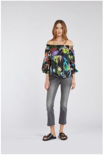 Blusa con escote elástico que deja los hombros al descubierto. Mangas fruncidas en los puños con un delicado efecto abullonado. Disponible en tres estampados exclusivos.