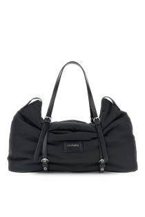Bolso de compras de nailon suave y acolchado, de corte holgado, con correas ajustables con hebillas y ojales. Una placa frontal con letras le da un toque urbano y chic.