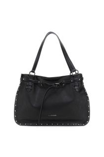 Bolso de compras suave de piel sintética descolorida y desgastada con ribete remachado. La correa presenta una hebilla y un detalle de letras metálicas que le dan un toque atrevido y distintivo.