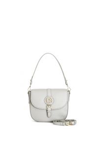 bolso bandolera de piel martillada con solapa con logo de metal sage