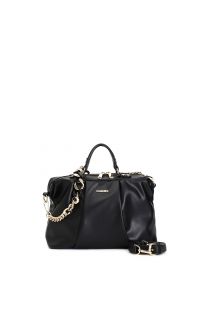 Bolso baúl blanda con pliegue central y logotipo metálico. asas planas. doble bandolera de cadena bicolor o del mismo material que el bolso. cierre de cremallera.
