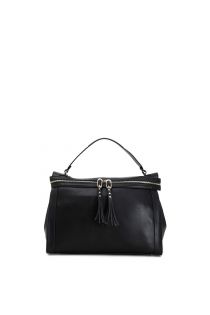 Bolso baúl con maxicremallera alrededor y tirador de cremallera de material deshilachado con dos hebillas metálicas falsas