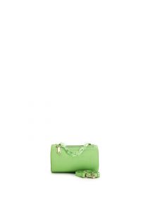 Bolso baúl pequeño en material de efecto mate con cierre de cremallera logotipo de alta frecuencia cadena de plástico para llevar en la mano y correa opcional para el hombro.