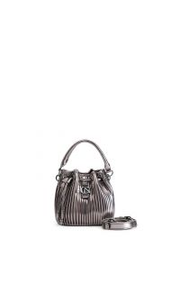 Bolso bombonera con cordón en material metálico plisado con detalle de logo metálico con pedrería. correa de hombro extraíble.
