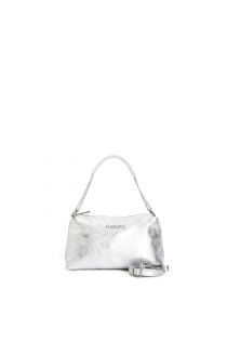 Bolso cámara de piel metalizada. doble cremallera con asa de cadena con asa. bandolera extraíble y cierre con cremallera.