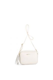 bolso cámara de piel texturizada con bandolera con mosquetones y borla beige