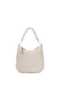 bolso con logo en relieve y bandolera de cadena tejida taupe