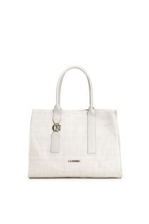 Bolso de forma cuadrada con asas a juego y accesorio cafènoir en el enganche del asa.
