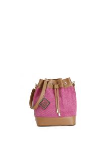 bolso cubo de rafia con jareta, adorno de piel y colgante fuxia/tan