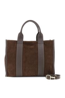 Bolso de ante con asas y detalles de piel martillada, logotipo metálico en la parte delantera y bandolera extraíble. Elegancia y funcionalidad en un accesorio chic para el día a día.