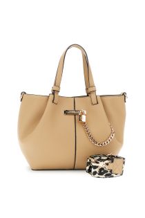 Un bolso de compras con efecto piel granulada gruesa, cadena con logotipo y candado metálico. Una correa de hombro con cinta de estilo animal le da un estilo atrevido, práctico y súper moderno.