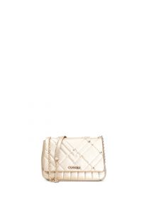 Bolso de hombro con solapa y pespuntes adornados con tachuelas piramidales e las intersecciones. Para llevar también como bandolera alargando la cadena