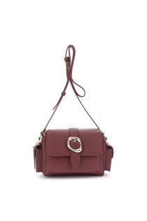 Bolso de hombro de piel sintética martillada con solapa con hebilla asimétrica y múltiples bolsillos laterales. Correa ajustable para llevar dos objetos.