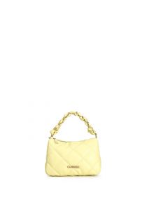 Bolso de mano de material suave con pespunte romboidal y asa de cadena con enhebrado con bandolera opcional.