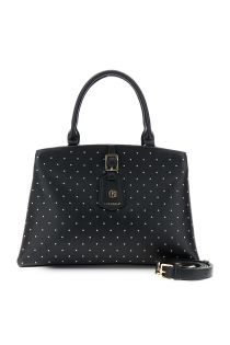 Bolso de piel sintética con microtachuelas y un colgante de hebilla decorativa. Incluye un divisor interior y una correa de hombro extraíble.