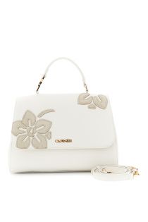 bolso de mano con solapa en material efecto piel con aplicaciones florales. ivory