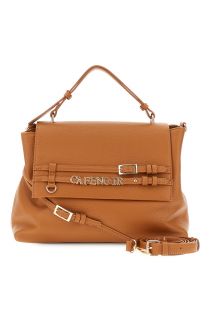 bolso de mano efecto piel granulada con letras y hebillas. tan