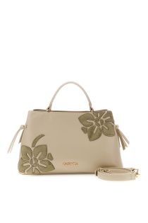 bolso de mano en material efecto piel con aplicaciones florales. kaki