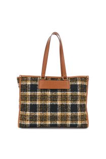Bolso tote de tela a cuadros con ribete de piel sintética y placa con el logotipo grabado. Cuenta con dos compartimentos con cremallera y un compartimento central con solapa. Práctico y espacioso, ideal para el día a día.