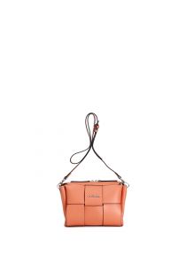 Bolso de mano tejido sin forro con bandas anchas cierre de cremallera superior y correa ajustable para el hombro.
