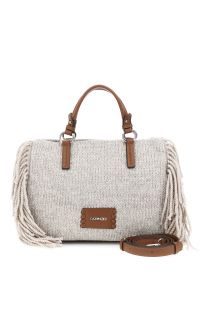 Bolso de punto efecto lana con flecos laterales, asas dobles y bandolera ajustable. Detalles de piel sintética, etiqueta frontal con el logo y botones decorativos en los laterales.