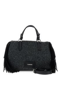 Bolso de punto efecto lana con flecos laterales, asas dobles y bandolera ajustable. Detalles de piel sintética, etiqueta frontal con el logo y botones decorativos en los laterales.
