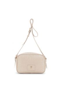bolso para cámara con efecto piel y logotipo grabado por toda la superficie. tortora