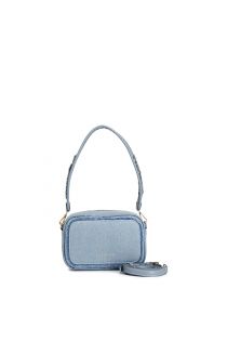 Bolso para cámara en denim deshilachado con flores de piedra y pedrería. cierre de cremallera. doble bandolera