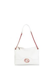 Bolso saco con logotipo esmaltado oval multicolor y cadena enroscada. bandolera con cadena enhebrada. cierre de cremallera.
