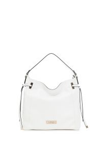 Bolso saco con una importante empuñadura decorativa en el cuadrante delantero y lazos anudados en los costados