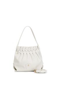 Bolso saco con pliegues suaves y detalles de punto smock con etiqueta aplicada. cierre de cremallera. bolso con bandolera.