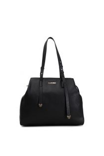 Bolso shopping grande enriquecido con la posibilidad de abrir y cerrar la parte superior del bolso con un mosquetón, haciéndola cambiar de forma. Asas con decoración efecto hebilla