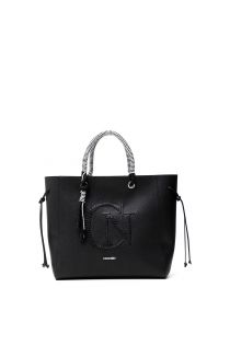 Bolso shopping particular de piel sintética, con el nuevo monograma CN bordado y asa de cuerda de dos colores, que deja salir un simpático fleco asimétrico. Cordón lateral del mismo color.