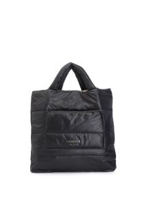 Bolso shopping de nailon acolchado reversible con un lado liso con bolsillo plano y un lado estampado con la inscripción "be noir" y logotipo de goma.