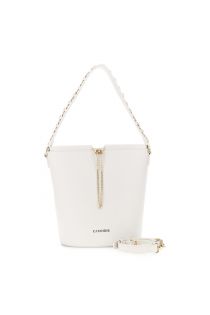 bolso tipo cubo con cordón adornado con cadena de metal. ivory