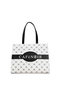 Bolso Tote de hombro con impresión en el cuadrante delantero y en la parte trasera y una cinta central con logotipo en contraste. Acabados negros y cierre con cremallera.