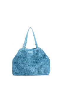 bolso tote de croché con charm de corazón de colores y borde de rafia aquamarine