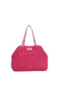 bolso tote de croché con charm de corazón de colores y borde de rafia hot pink