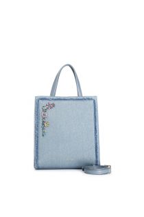 Bolso tote con asas de denim deshilachado con flores de piedras y pedrería. cierre magnético automático. bolso con un compartimento. bolso con bandolera.
