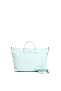 Bolso de piel de forma trapezoidal con asas y bandolera opcional.