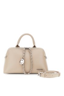 Bolso trapezoidal de piel sintética con cremallera visible, cadena decorativa y colgante metálico. Incluye bandolera ajustable y extraíble.