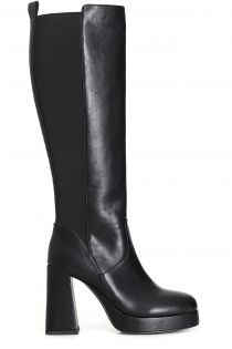 Bota alta elástica en polipiel con elástico en la parte trasera. plataforma de 22 mm y tacón de 100 mm. forma redondeada. la plantilla es de piel. todo esto da equilibrio entre altura belleza y comodidad.