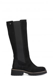 Bota de piel serraje con elásticos con tachuela personalizada. tacón de 50 mm de altura. la plantilla es de piel.