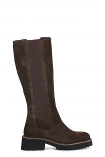 Bota de piel serraje con elásticos con tachuela personalizada. tacón de 50 mm de altura. la plantilla es de piel.