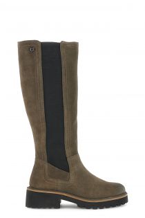 Bota de piel serraje con elásticos con tachuela personalizada. tacón de 50 mm de altura. la plantilla es de piel.